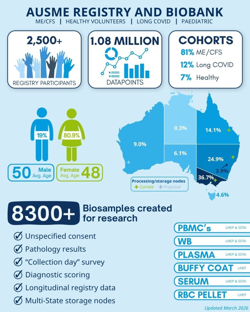 Offering a comprehensive dataset of well-characterised participant data and biosamples (blood), the ME/CFS Registry and Biobank provide crucial support to Australian medical researchers and their endeavours, aimed at advancing knowledge and uncovering essential diagnostics and effective treatments, for the very individuals they represent.