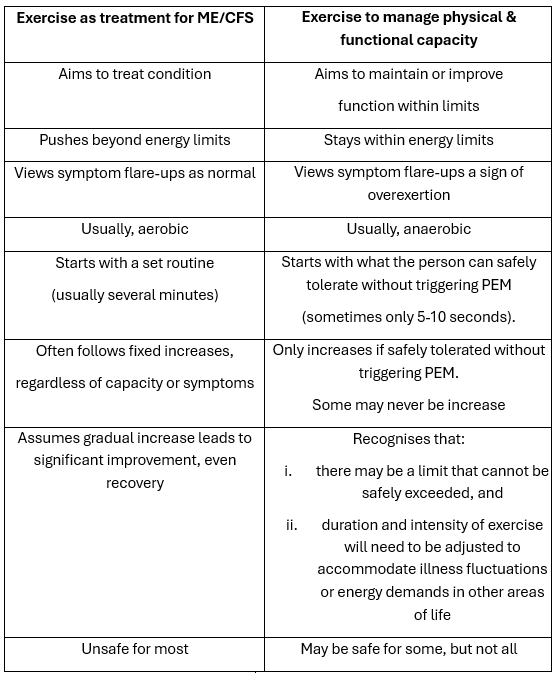 This approach differs from GET and traditional forms of rehabilitation, as it does not aim to treat the underlying condition or push beyond limits. Instead, it focuses on working within the person’s available energy reserves. This must be approached with great care.